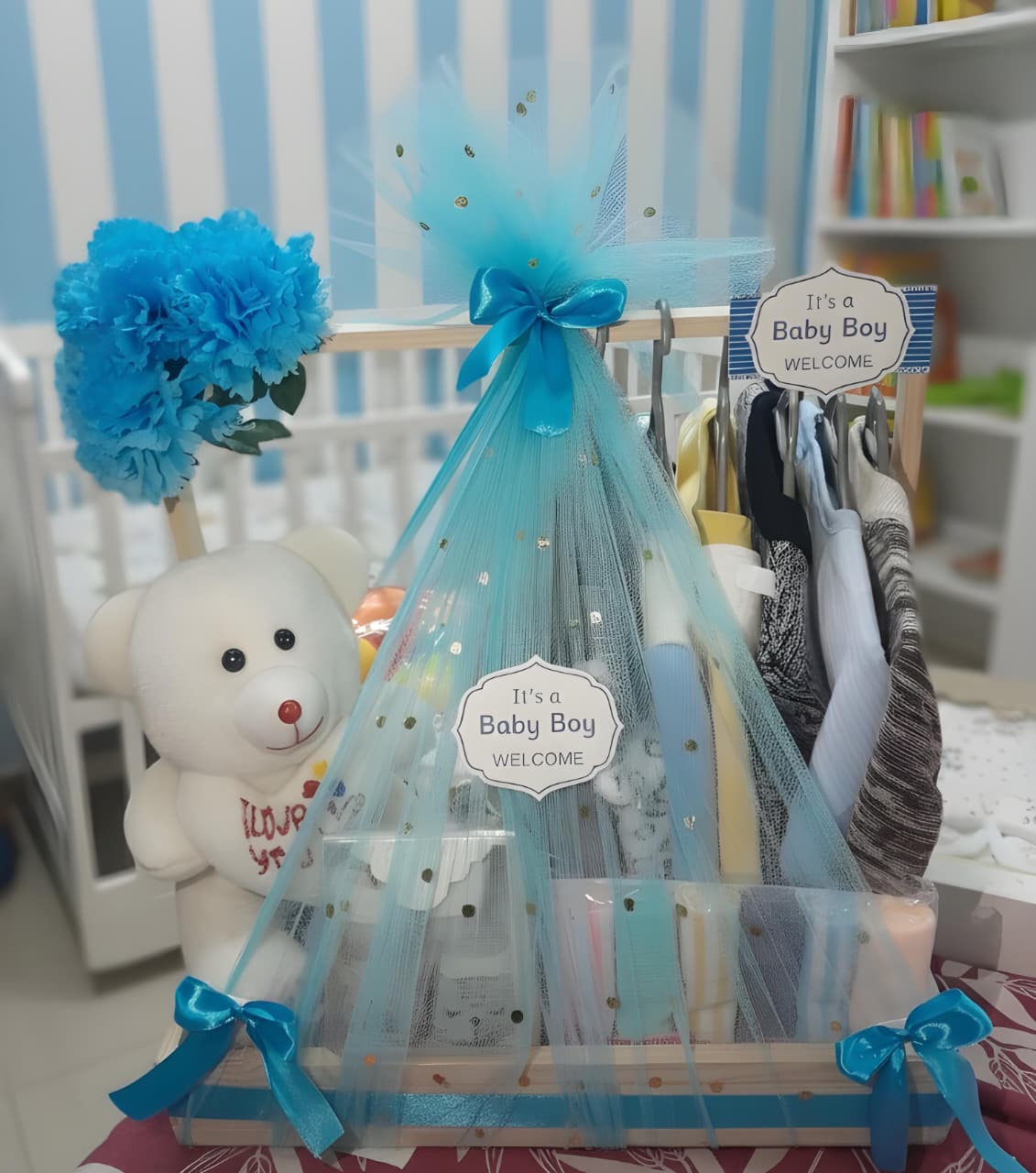 Beautifully designed customizable gift basket for baby showers.